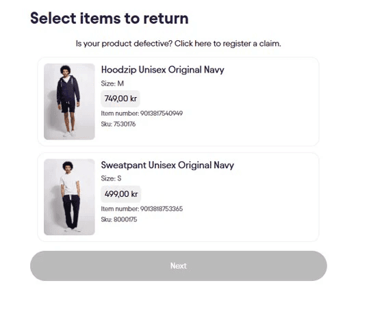 After logging in with the email you used to order and the order number (exclude ‘’#RM’’) you will find the order overview. You have to register a return or exchange for one item at a time.