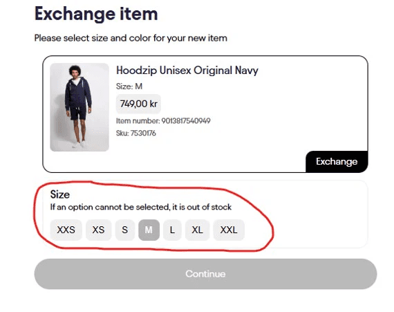 To make the exchange you simply click on the new size you want to receive and on ‘’continue’’.